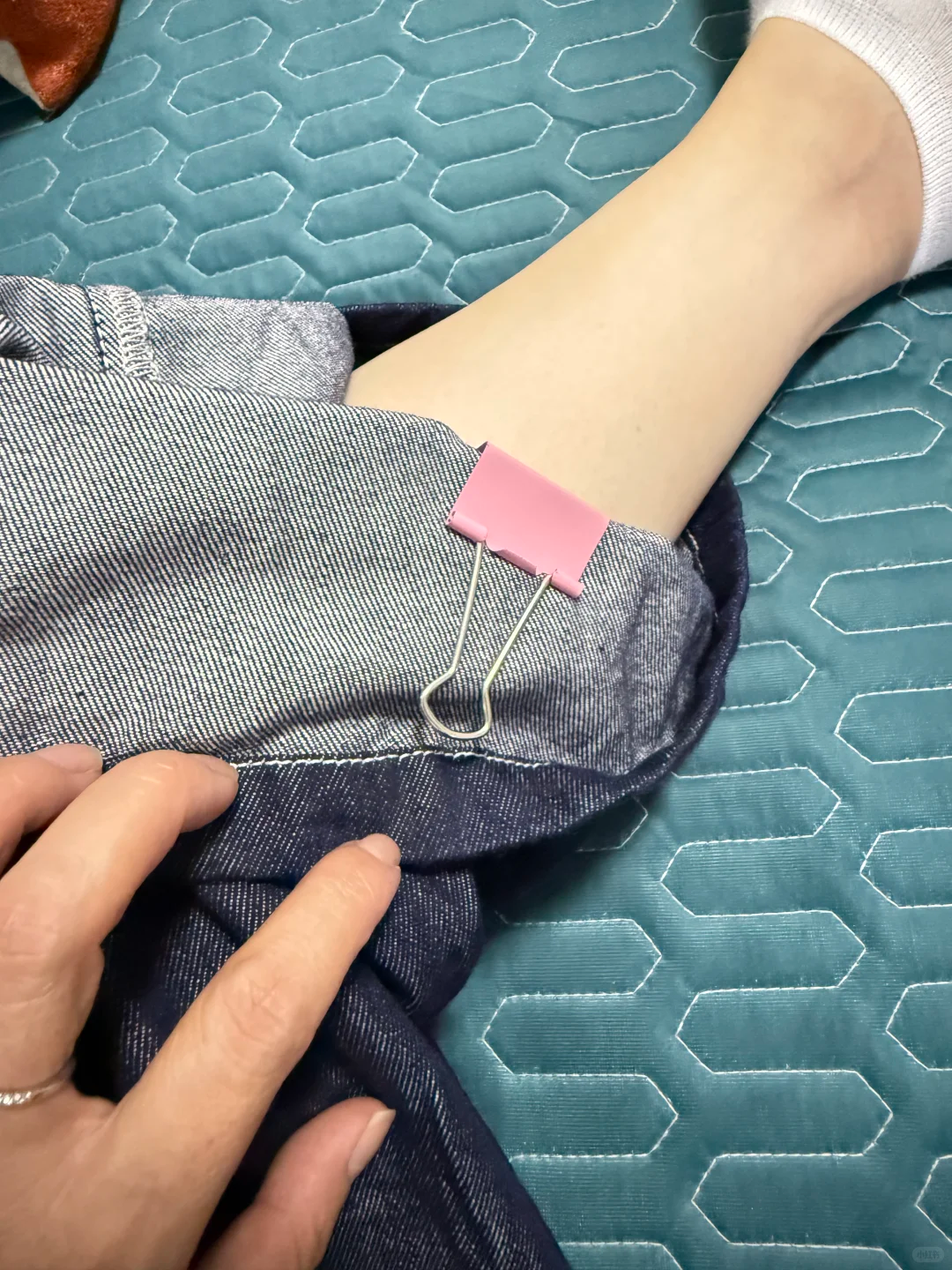 想要延长也不可能用燕尾夹在里面将裤子夹一下就可以了。这样放下裤子看不出来。完美隐藏,而且裤子的长短可以用燕尾夹来调整。