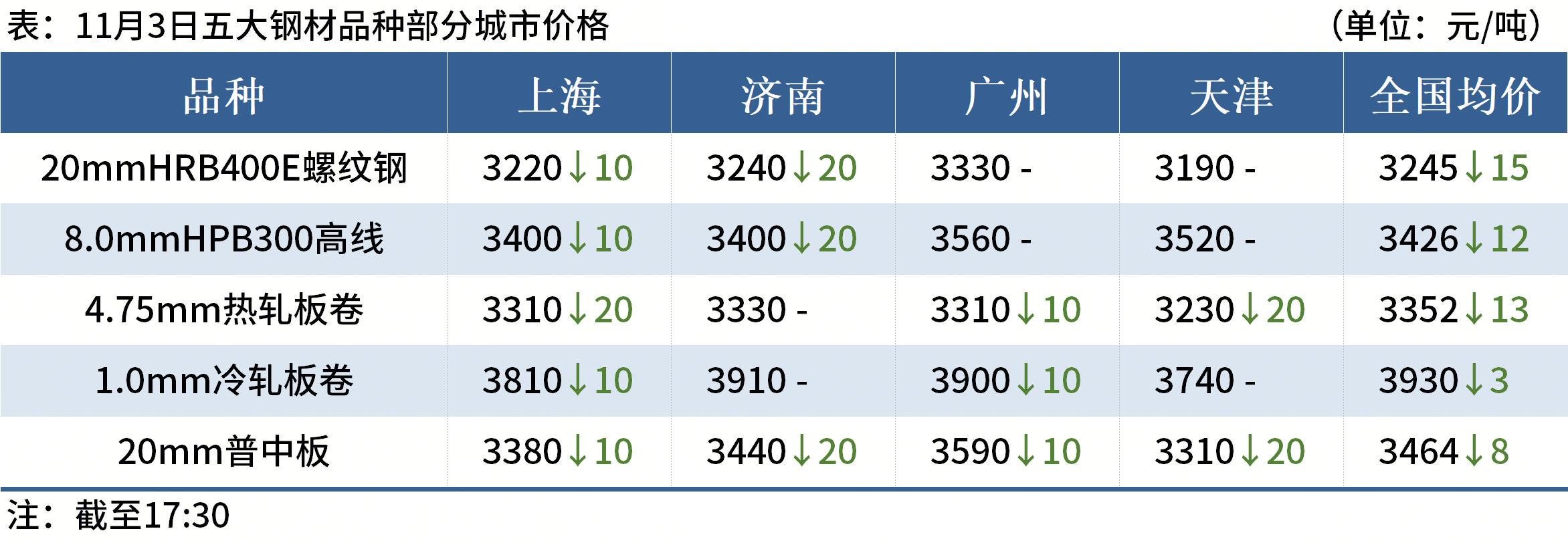 ◎11月3日,沙钢出台11月上旬出厂价,螺纹钢、盘螺价格暂稳,现螺纹钢3450元/吨,盘螺3560元/吨。