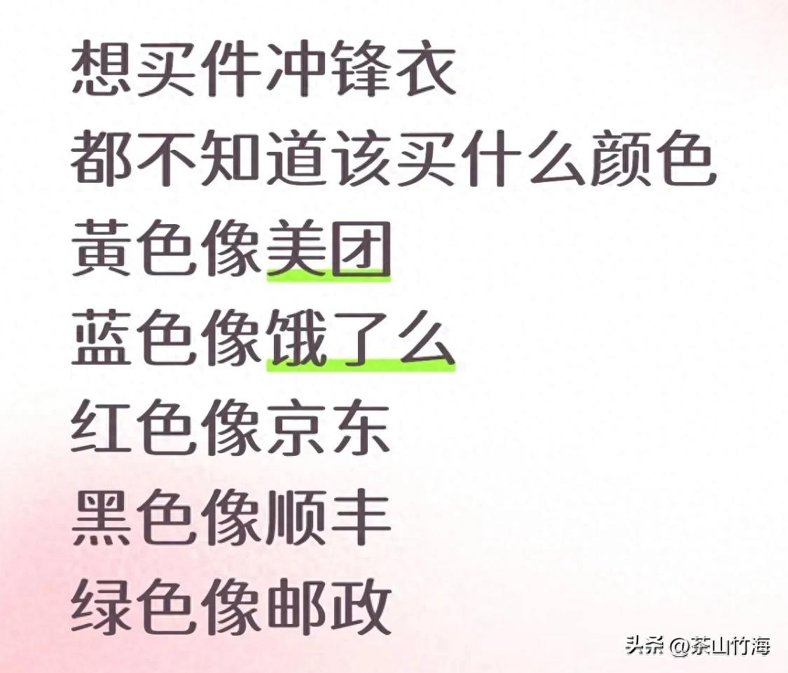 广东湿冷天,冲锋衣成刚需,可穿错颜色秒变"骑手"——电梯被塞退件、保安喊"送餐往这边",全因踩中平台"垄断色"。