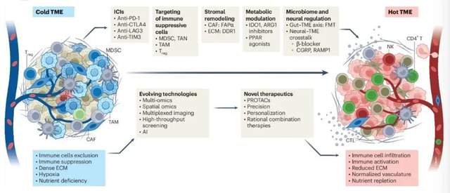 疗效不佳的根源,和肿瘤的“免疫状态”密切相关。只有那些有大量T细胞浸润、预先具备抗肿瘤免疫力的“热肿瘤”,才能对ICIs有积极响应。而“冷肿瘤”则截然不同,肿瘤组织内T细胞少,还被髓系抑制细胞、调节性T细胞等免疫抑制细胞包围,如同“免疫荒漠”,对ICIs天生耐药,成了癌症免疫治疗的棘手难题。