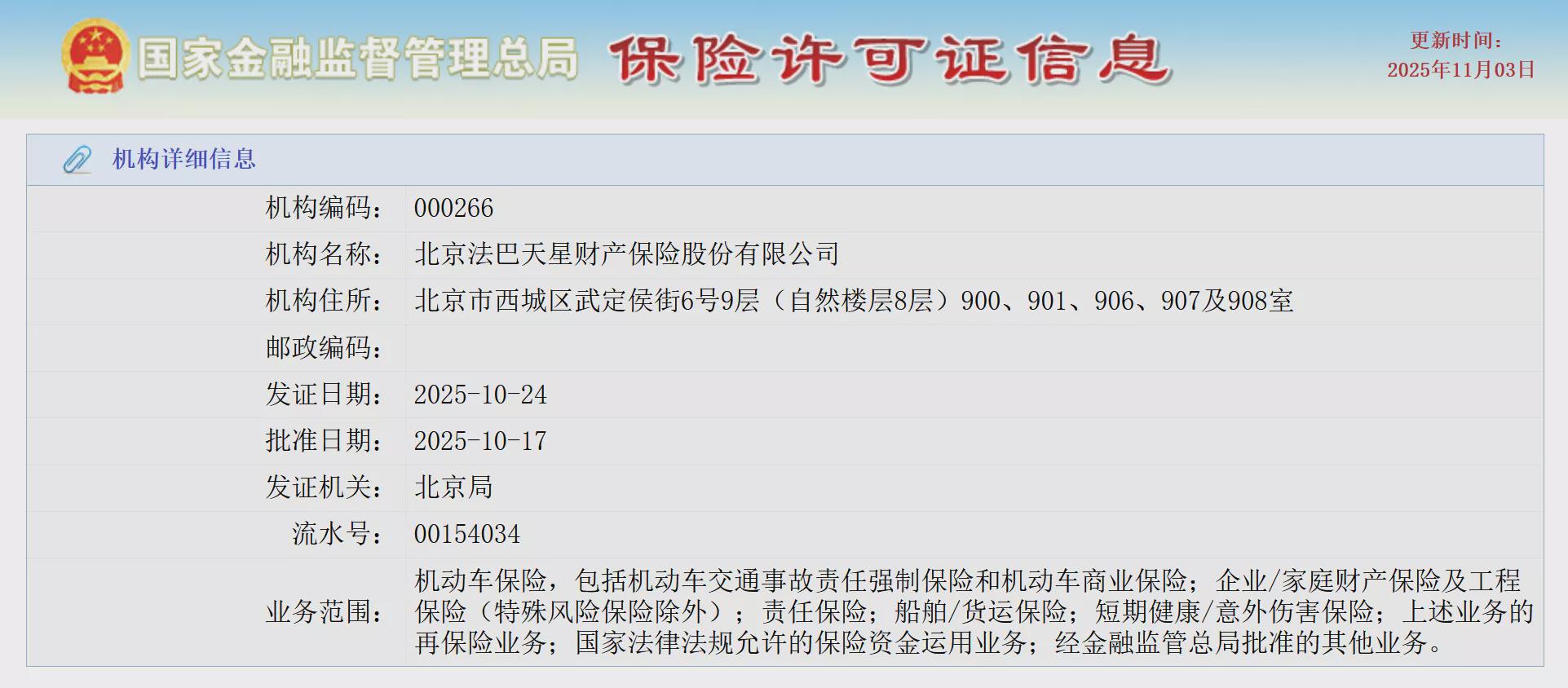 11月4日,国家金融监督管理总局网站信息显示,北京法巴天星财产保险股份有限公司获得保险许可证,批准日期为2025年10月17日,发证日期为2025年10月24日,发证机关为国家金融监督管理总局北京监管局。