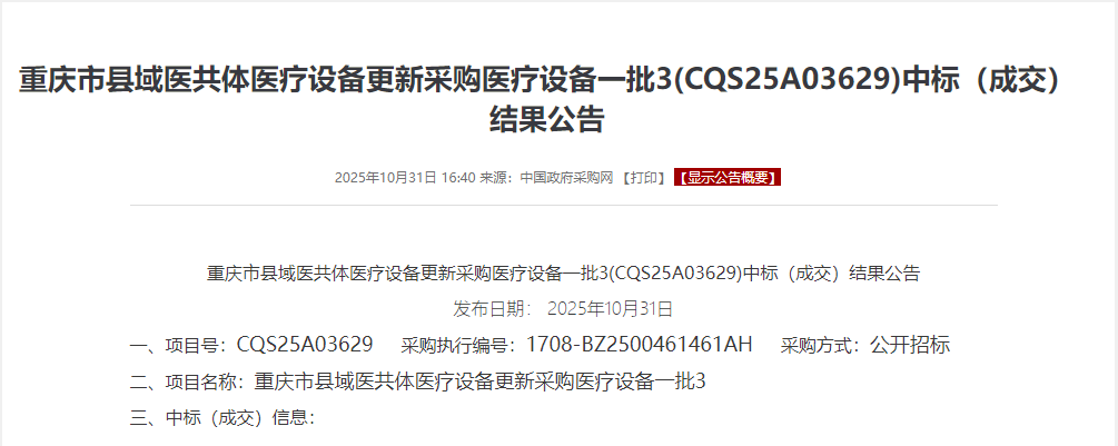 10月31日,中国政府采购网发布了多个重庆市县域医共体医疗设备更新采购医疗设备中标(成交)结果公告,迈瑞共计中标91台,合计中标598.91万。