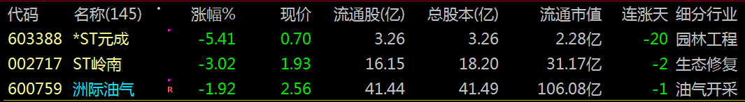603388 *ST元成 002717 ST岭南 600759 洲际油气