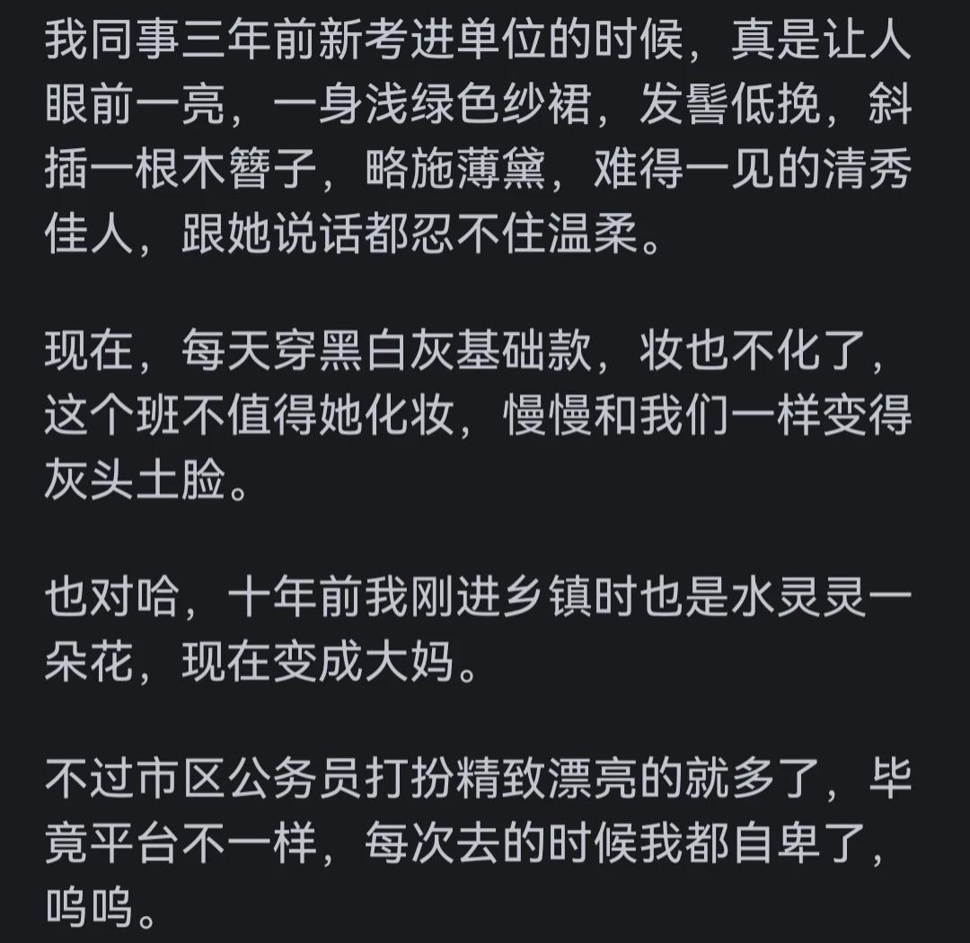 别说刚进体制了,我读研之前,都是人见人夸的美女。。研究生毕业成胖大姐。。现在体制内干了几年,成满脸风霜面露凶色的胖阿姨了
