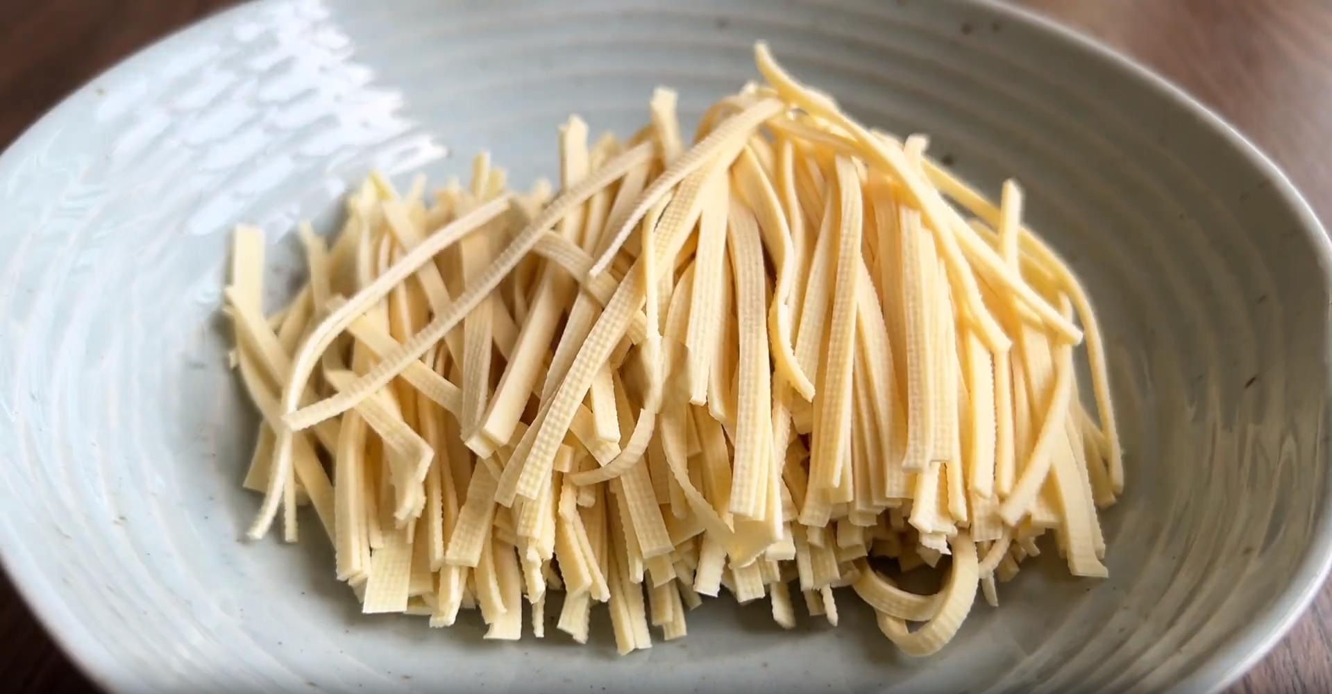 5、准备一张豆皮,先给它切成小块,再改刀切成细丝,用它来拌海带丝,吃起来的口感会更好,切好之后,装入盘子中。