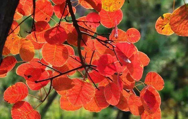 黄栌适应性强,耐寒耐旱,在北方山地和园林极为常见,是秋季重要的观叶树种,比如著名的香山红叶——许多人以为登香山是去赏枫叶满山,其实香山一带主要的树种是黄栌。黄栌的叶片不像枫叶呈掌形,而是呈卵圆形或倒卵形,秋季变为艳红色或紫红色。黄栌的根和叶还是中药材,具有活血化瘀的功效。