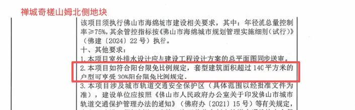 而就在11月5日,桂城挂牌一宗宅地,出让文件同样出现了相似表述:本项目如符合阳台限免比例规定,套型建筑面积超过140平方米的戶型可享受30%阳台限免比例规定。