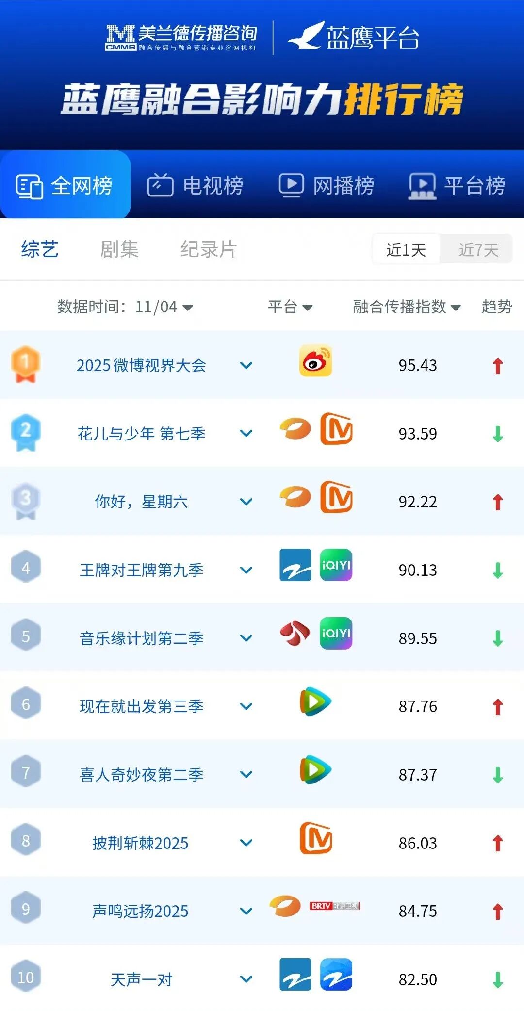 全网综艺融合传播指数(11月4日)