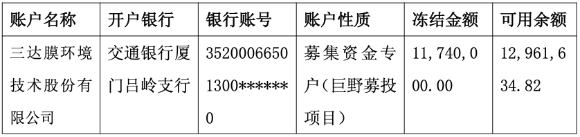 三达膜还表示,截止本公告披露日,除上述银行账户被冻结情形外,公司及下属子公司其他银行账户均不存在被司法冻结的情形。目前公司及下属子公司银行账户被申请冻结金额为98,817,933.28元,占公司最近一期经审计净资产的2.44%。公司将合理安排和使用资金,降低上述事项对公司的影响。