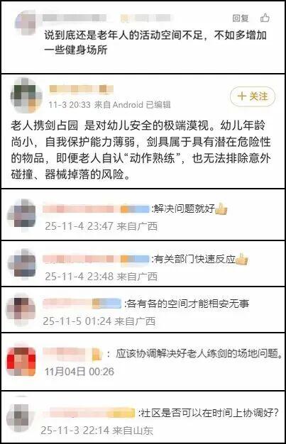 近日,江苏扬州市民仲女士发布的一段“老年人占据幼儿园操场练剑”视频引发热议。