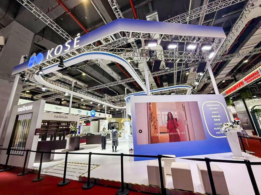 雅诗兰黛集团则以“重塑美妆新境、共赴蓬勃未来”为主题,连续第七年参展,展台设计采用流线型结构与梦幻光影交织的风格,营造出兼具优雅与先锋气质的“现代美学殿堂”,层叠错落的外观细节呼应中国消费者对美的进阶追求。