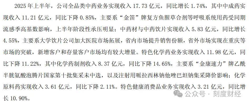 不过,2025年上半年,健康消费品收入仅占公司主营业务收入的9.68%,远低于全品类中药(53.49%)与特色化学药(36.15%),难以对冲主业下滑。