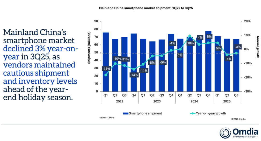 根据Omdia发布的《Smartphone Market Pulse: 3Q25》报告,2025年第三季度中国大陆智能手机总出货量为6720万台,较2024年同期的6910万台下滑3%。