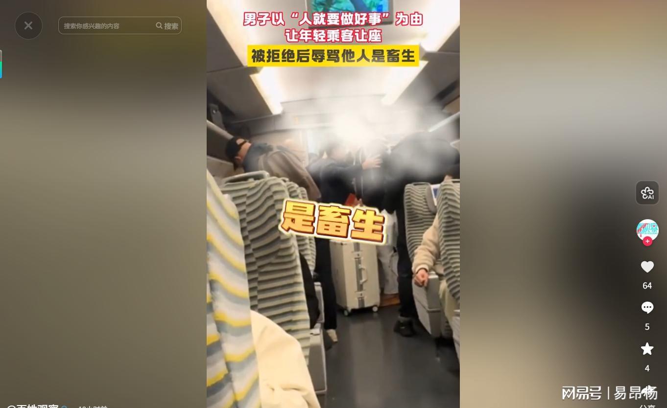 反倒是站在一旁的小伙,根本不理会老人那套道德绑架的说辞,只想着赶快要回自己的座位。