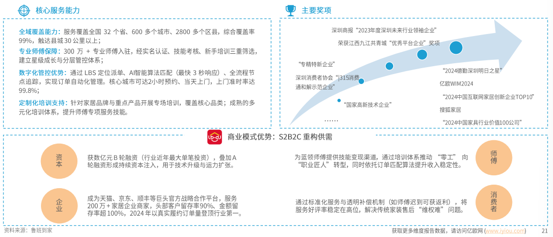 家居服务行业涌现出了众多优秀企业,如鲁班到家以S2B2C模式聚合全国300多万专业蓝领师傅,打造中国蓝领技能服务平台,为企业和家庭用户提供“安装、维修、清洗、测量、局改” 等一站式技能服务,广泛覆盖大家居全品类、全类目、全区域。基于服务行为大数据算法、服务交付数字化和服务流程标准化,致力于构建可持续的服务产业互联网生态,帮助企业用户降本增效,帮助消费者改善服务体验,帮助师傅用户技能价值变现,重新定义蓝领技能服务标准。