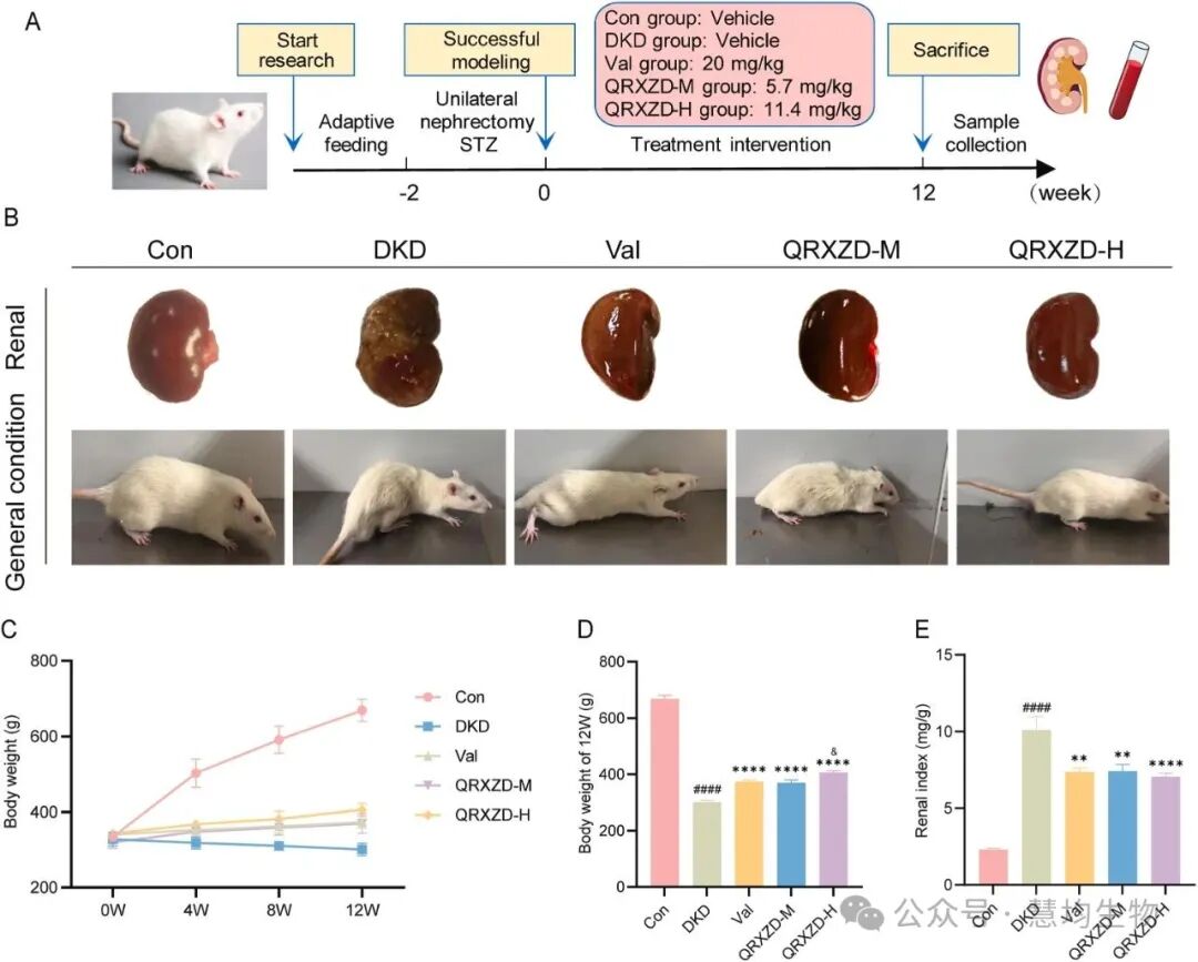 方法: 首先,采用网络药理学和分子对接相结合的综合方法预测了QRXZD在DKD治疗中的潜在靶点和机制。随后,建立DKD大鼠模型,评价QRXZD的肾保护作用。通过病理染色、生化分析、蛋白质印迹、免疫组化、酶联免疫吸附法和免疫荧光法阐明QRXZD在DKD治疗中的潜在机制。