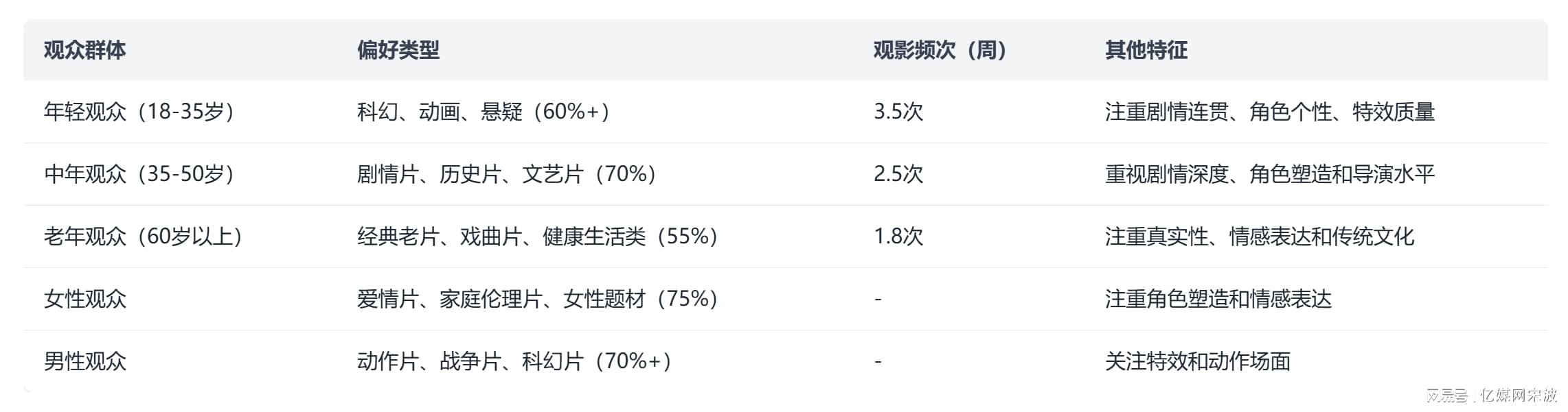 老年观众(60 岁以上)的观影习惯呈现独特特征。他们对经典老片、戏曲片和健康生活类影视作品兴趣浓厚,占比约 55%,对电影中的真实性、情感表达和传统文化有较高要求。老年观众的观影时间主要集中在下午和晚上,平均每周观影次数为 1.8 次,更倾向于观看具有回忆价值和亲情价值的电影。