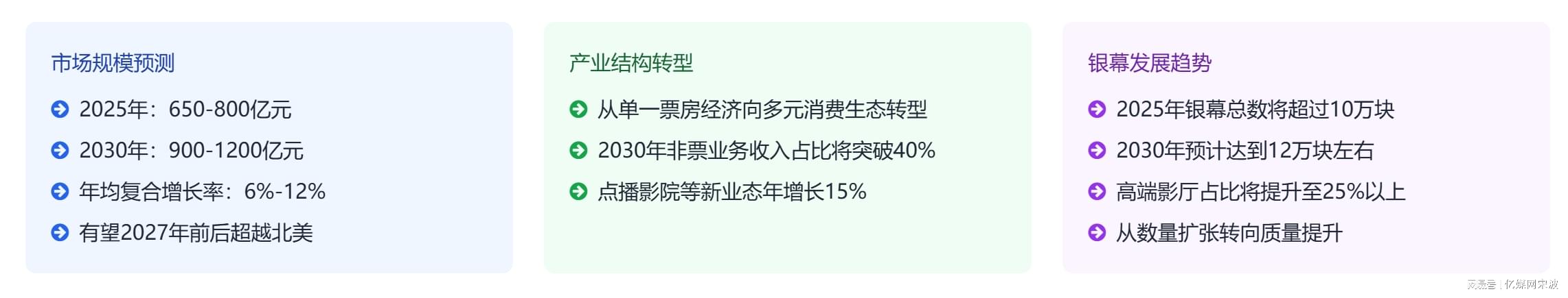 基于当前的发展态势和多重驱动因素,中国电影市场在未来十年将呈现稳健增长态势,但增长模式将发生根本性转变。亿媒网观察多家机构的预测,中国电影市场规模将在 2025 年突破 650-800 亿元,2030 年有望达到 900-1200 亿元,年均复合增长率保持在 6%-12% 区间。