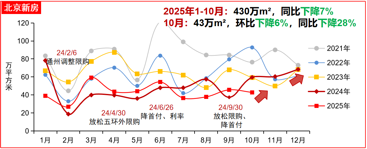 克而瑞统计数据也显示,2025年10月北京新建商品住宅(含普通住宅、别墅,不含共有产权房)成交3194套,环比下跌1.9%,同比下跌22.9%;成交均价为58649元/平方米,环比下跌2.4%,同比上涨3.5%。