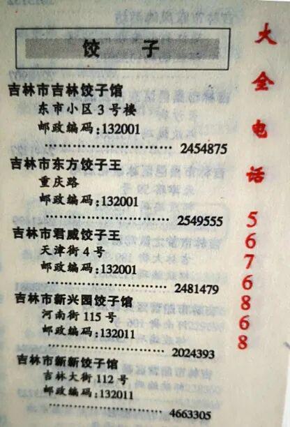 之所以提一下这家饺子馆,在于我第一次在吃饭店里吃饺子,就是在吉林饺子馆。大概是1990年左右,我和朋友去吃店里吃饺子,不记得点了什么,只记得当时曾感慨饭店里的饺子和家里包的果然不一样。那时的吉林饺子馆应该是在开封街,好像是在今国贸大厦的门洞子里偏东,并非《黄页》记载的东市小区3号楼——这次店址变化当是九十年代末兴建国贸购物中心导致的拆迁。