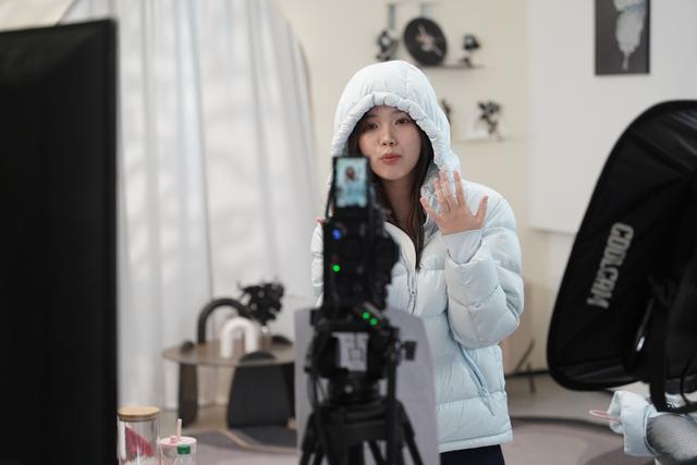 顺应电商趋势成为新的选择。徐忠介绍,目前,工厂负责售后环节的员工有200多人。在办公大楼里,这家企业同时有8个直播间在全天候直播。四五盏大灯打亮三四十平的直播间,女主播在镜头前一秒不停地口播,一件件试穿产品。