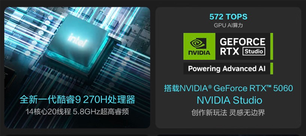 作为全新一代标压处理器,英特尔酷睿9 270H采用先进制程工艺,拥有14核心20线程(6性能核+8能效核)的多核高性能优势,至高睿频达5.8GHz,并配备24MB L3缓存。其性能核与能效核协同的架构设计与基础功耗设定,精准契合全能本对多任务处理、高响应速度与能效平衡的严苛需求。
