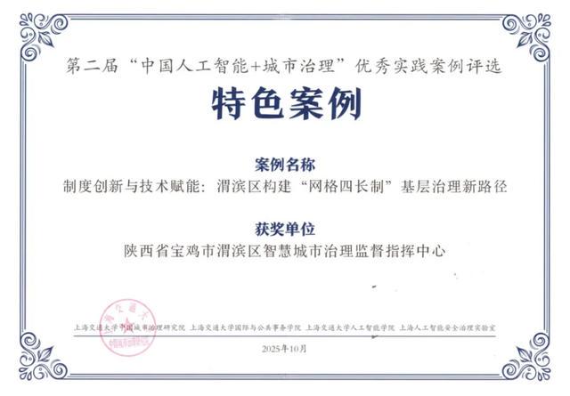 渭滨区“四长制”基层治理案例荣获第二届“中国人工智能+城市治理”案例大赛特色案例奖。