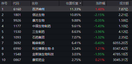 截至11:08,港股通创新药ETF(159570)标的指数权重股多数飘绿:三生制药跌超3%,信达生物跌超2%,中国生物制药、石药集团跌超1%,康方生物、翰森制药微跌。上涨方面,百济神州、科伦博泰生物-B逆市涨超1%。