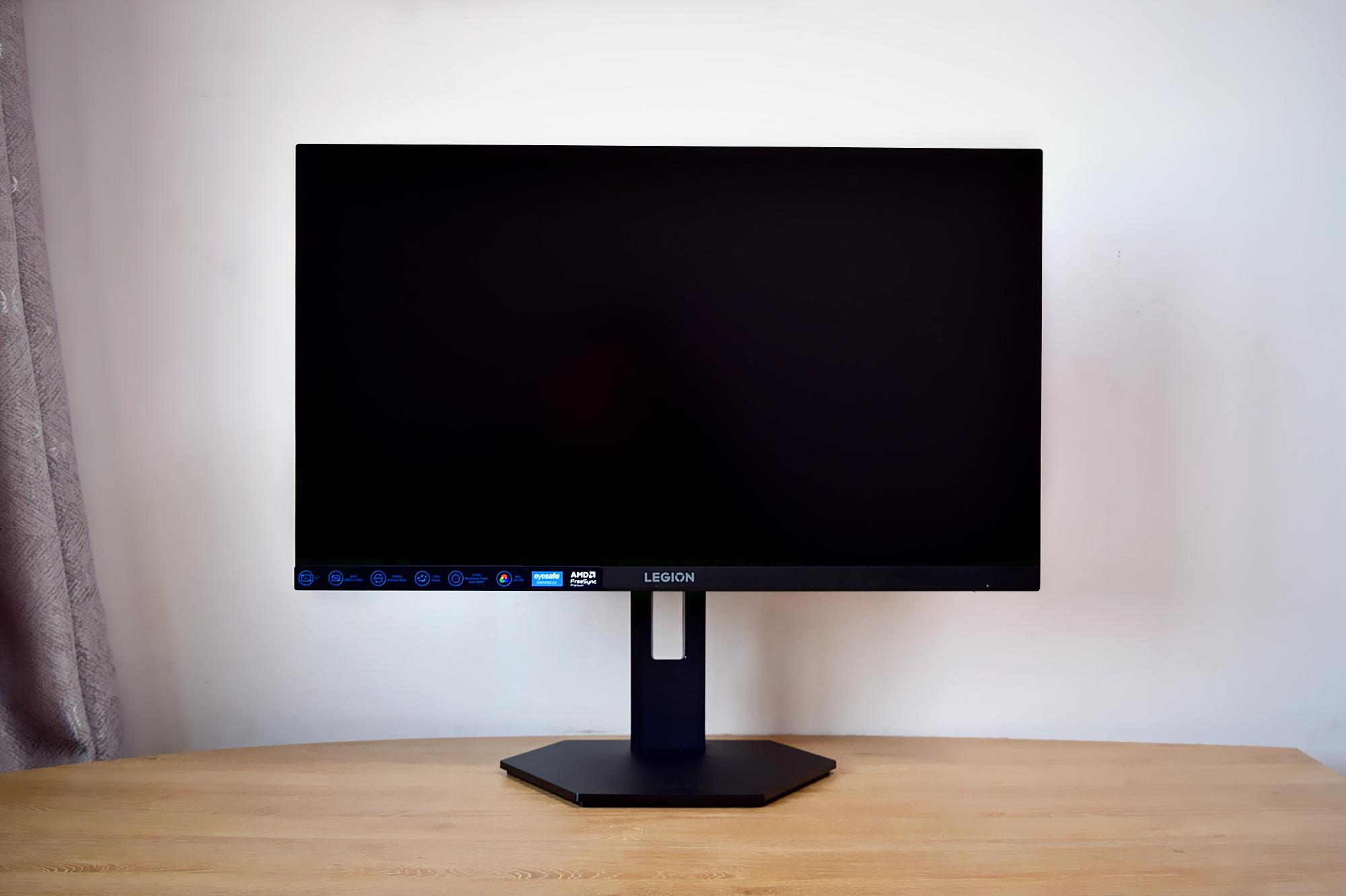 显示器的背面设计也很简洁,顶部中间位置是银色的“LEGION”品牌logo,侧面棱角分明,再搭配蜂窝矩阵纹路的支架,让整体看起来更具电竞氛围感。
