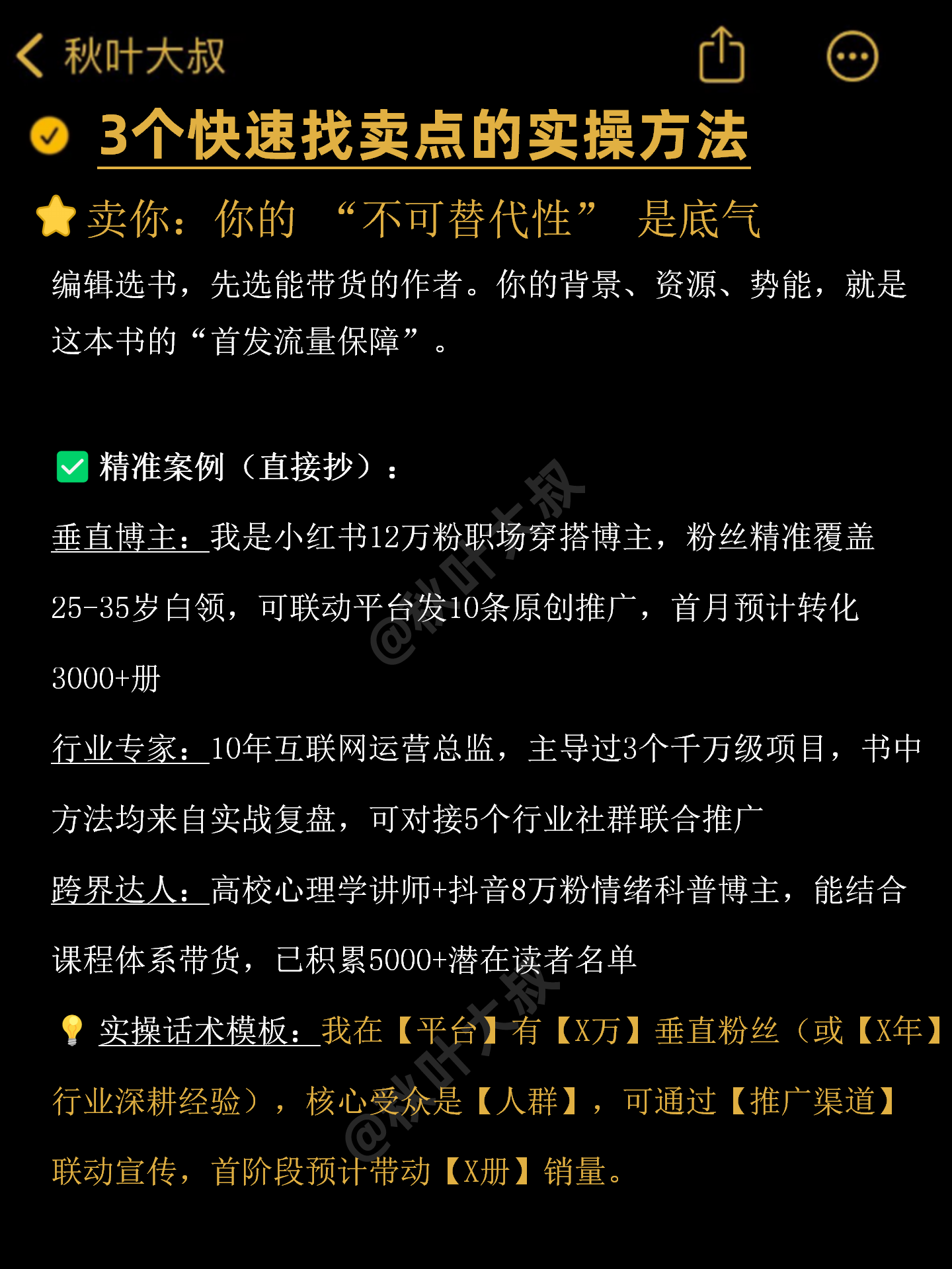 今天直接给你可落地的卖点提炼公式 + 实操方法,照做就能让编辑主动追着你签合同,详细内容直接看图片。