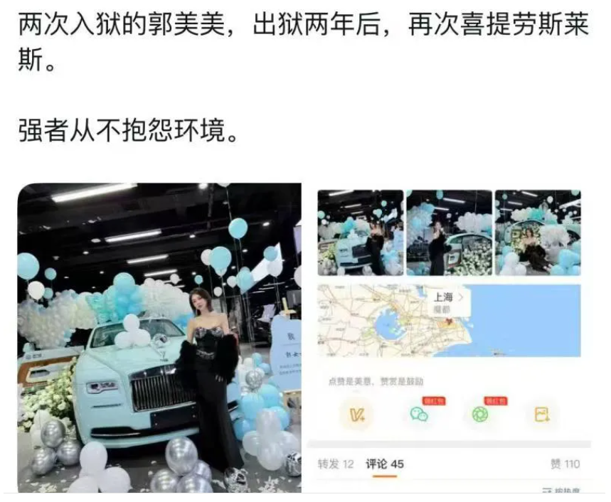引来了不少网友羡慕!有人甚至还给配上了一段很正能量的文案:两次入狱的郭美美,出狱两年后,再次喜提劳斯莱斯。强者从不抱怨环境。