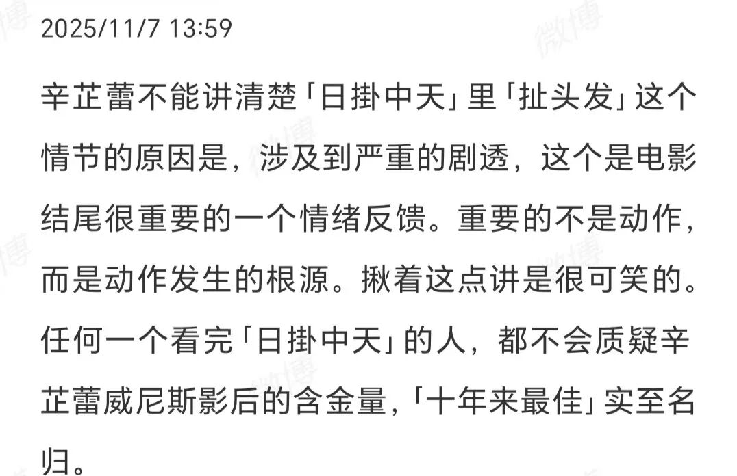 11月7日,恰好是《日掛中天》在内地上映的日子,对于靠“扯头发”获得影后,辛芷蕾第一时间在个人社交平台发文回应。