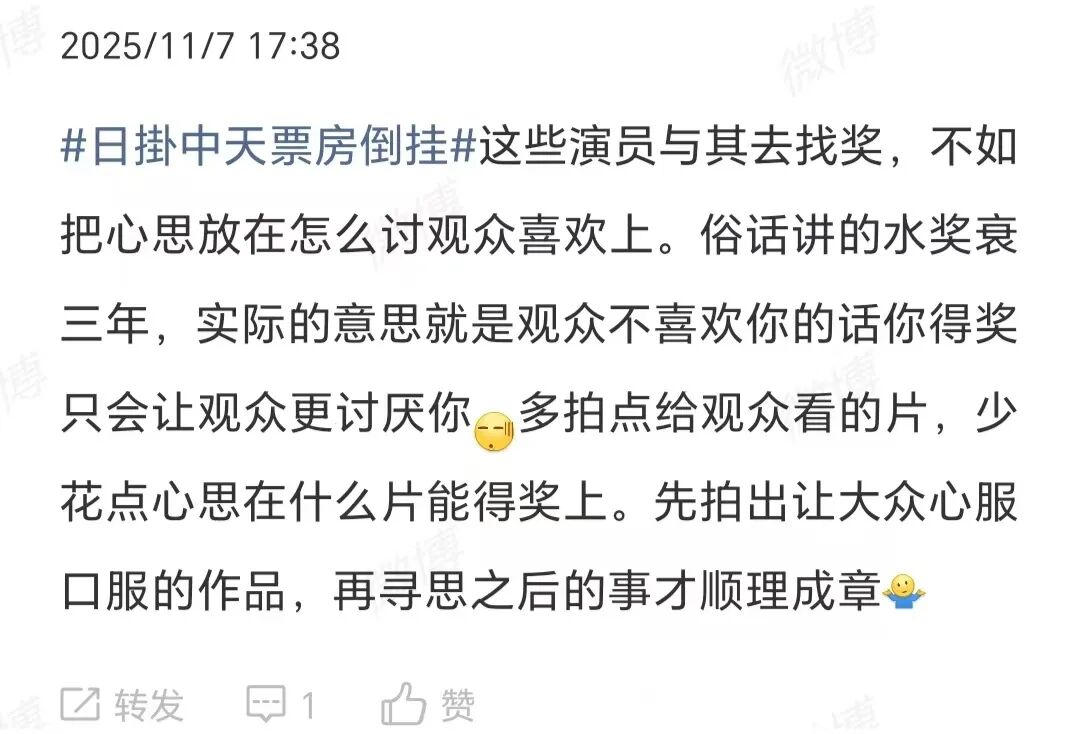 既然影视剧需要观众们买单,观众们才是最终的评委。就像有观众说的那样,与其纠结拿奖,不如好好在作品上下功夫,多研究如何拍观众喜欢认可的作品。