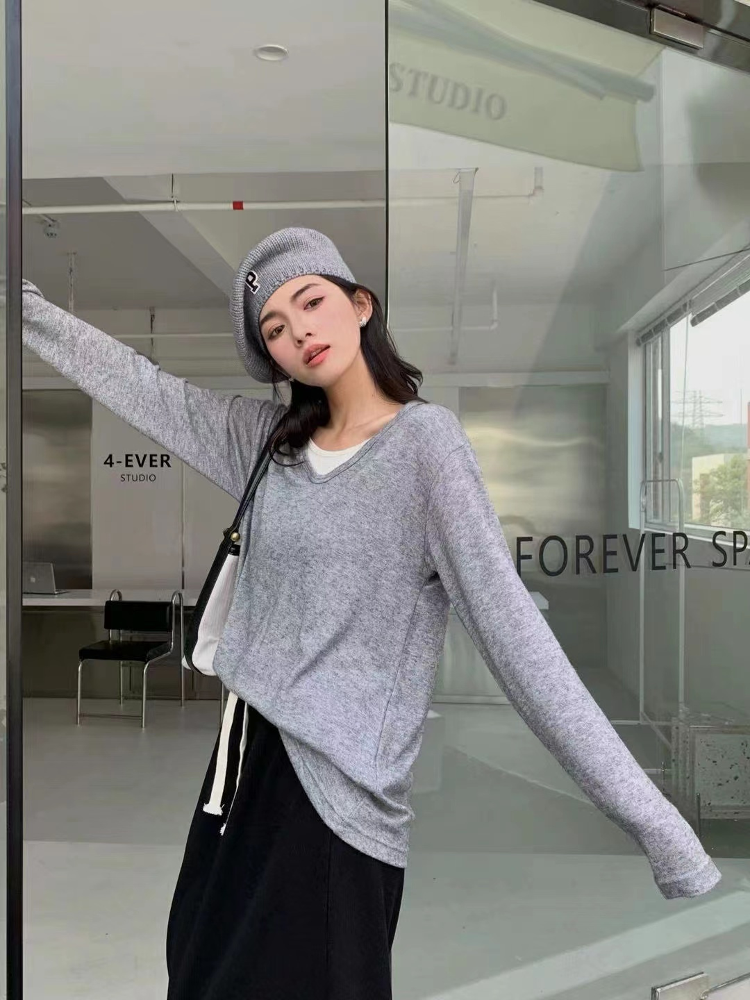 心机的还是它假两件的设计款式,领口相近却不同的莫兰迪色调,v领的的显露很容易拉直肩颈,制造直角肩哦~