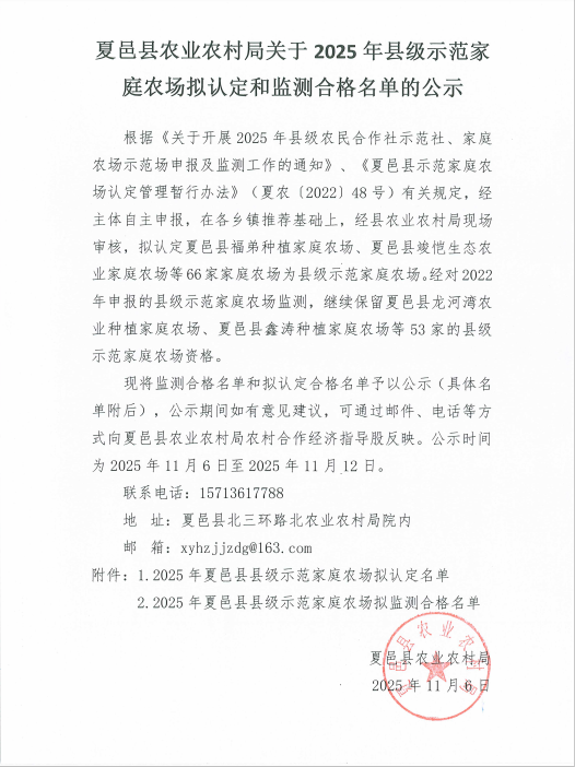 夏邑县农业农村局关于2025年县级示范家庭农场拟认定和监测合格名单的公示