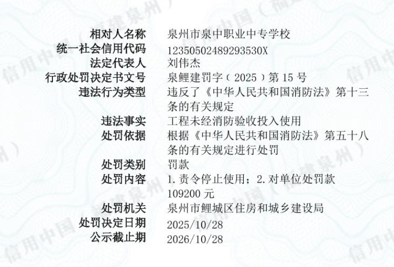 10月28日,泉州市鲤城区住房和城乡建设局对泉州市泉中职业中专学校处以罚款: