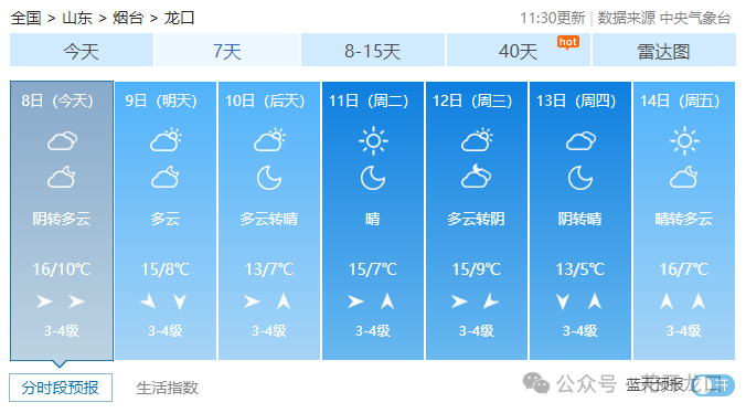 8日白天到夜间,临沂和南部沿海地区天气阴有小雨转多云,其他地区天气多云转晴;8日夜间,全省大部地区有雾或轻雾。半岛地区南风转北风3~4级,其他地区北风3~4级。夜间最低气温:沿海地区9℃左右,其他地区6℃左右。最高气温:鲁中山区14℃左右,其他地区17℃左右。