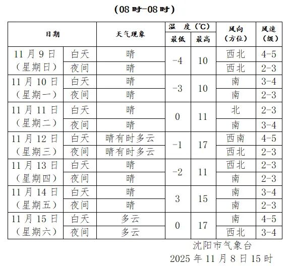 未来几天沈阳被晴好天气“承包”。周日白天最高气温10℃,但偏北风较大有4到5级,阵风7级,风寒效应明显,大家外出要穿得暖和一些,注意头部和手部的保暖。