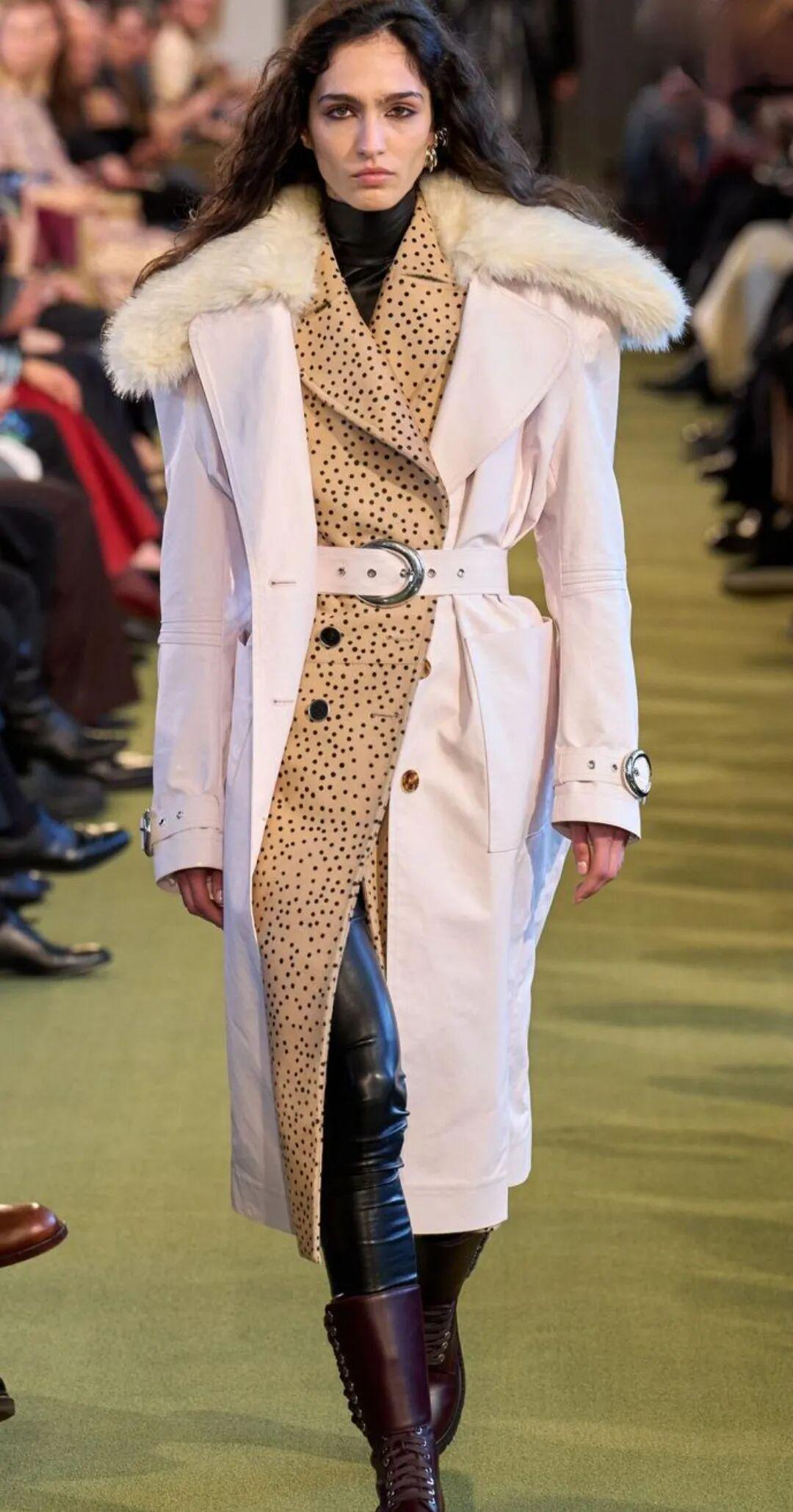 *长款的大衣服装在白色的干净中,还有一些波点元素的露出,以腰带的修身收腰,也让大衣的服装有着鲜明的层次。