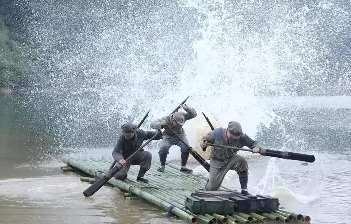 甚至有战士险些被卷入水中,为了避免悲剧发生,负责连接竹排的队员们开始用篾绳将自己和竹排绑在一起,这样即便被江水拖拽,也能及时被战友拉回岸边。