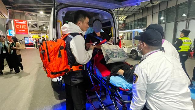 正在召开的第八届中国国际进口博览会上,记者见到这样一幕:一名志愿者突发受伤,无法站立。紧急时刻,正好巡诊至此的一名医生和一位护士上前施援。他俩熟练地为伤者作出伤情评估,发现他生命体征平稳,四肢肌力正常,得知伤者既往有腰椎间盘突出、常有疼痛症状,他俩决定先将伤者转运至定点医院完善检查。
