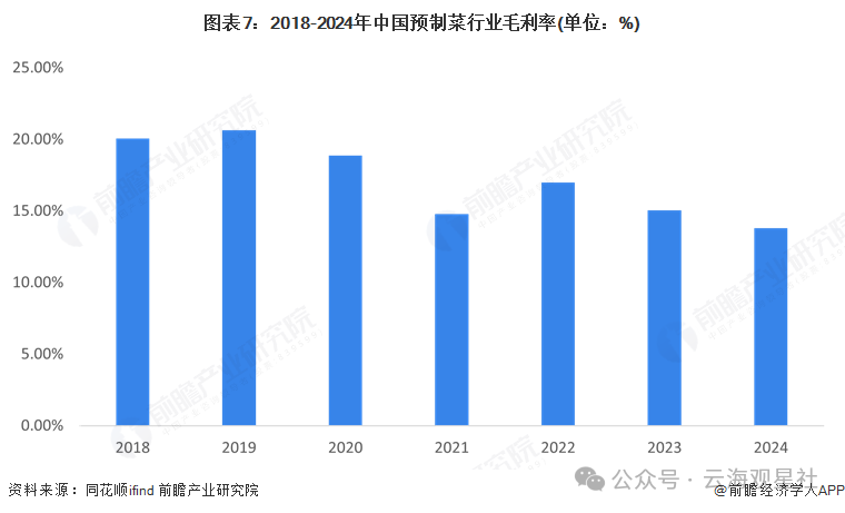 据同花顺数据,中国预制菜上市公司的毛利率整体呈下滑趋势,从2018年的20%降至2024年的14%左右。
