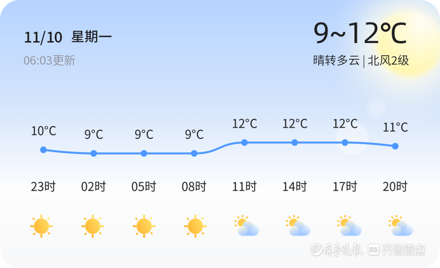 今天是2025年11月10日,星期一,农历九月廿一。烟台市今天天气晴转多云,气温在9℃到12℃之间,北风2级,空气湿度49%。空气质量状况为良好,适合市民外出活动。早晨气温较低,建议市民出行时注意保暖,适时增添衣物。