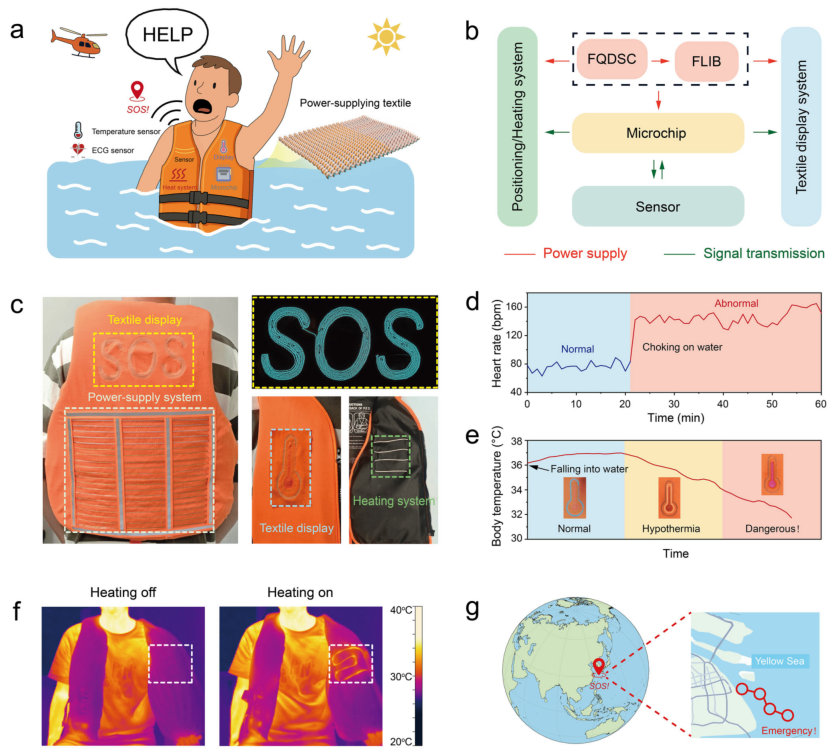 图5. 供电纺织品的可穿戴应用。 a) 集成于救生衣中的智能健康监测系统示意图,包括自供电纺织品、传感器、定位模块、加热元件和显示模块,能够实时获取并传输用户生理数据,同时提供紧急救援信息。 b) 集成智能救生衣的设计示意图。供电纺织品为显示系统、健康监测系统和紧急救援系统提供能量。 c) 智能救生衣实物照片,背部集成发光显示纺织品在低光环境下提供精确定位信息。 d) 用户落水后的实时心率监测曲线。 e) 用户在水中的实时体温监测,并向用户显示特定警报。 f) 加热元件激活前后的红外照片。当体温低于32℃时,加热元件可被激活。 g) 定位系统发送求救信号,并在地图上共享实时坐标位置。