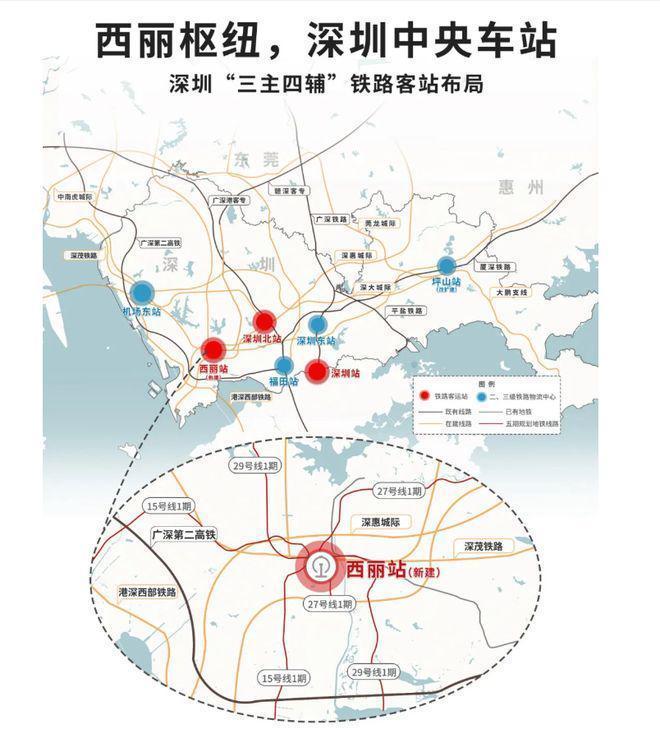 这里将引入赣深、深茂、深汕、深珠4条铁路。同时地铁13/15/27/29号线、深惠、深莞城际也将在此设站