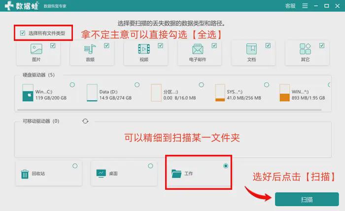 步骤1:启动数据蛙恢复专家后,在首页上设置好需要恢复的数据类型,然后再设置需要扫描的位置,完成设置后点击【扫描】按钮,让软件进入扫描状态;