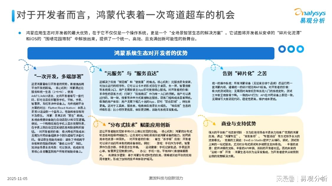 易观分析:中国移动应用市场产业发展规模巨大,应用生态是产业发展的奠基石,当前鸿蒙已经成为应用生态的第三极,适配十大赛道良好有序发展,凭借分布式协同、自主可控技术优势,在多领域效率提升显著,形成差异化竞争力。