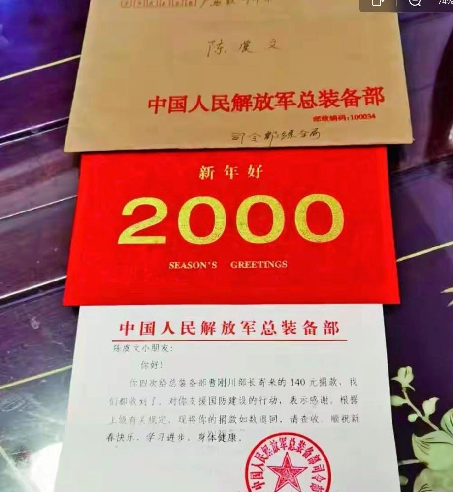 信中写道:非常感谢你对国防建设的支持,你的爱国情怀令人感动,是一位值得表扬的好少年。