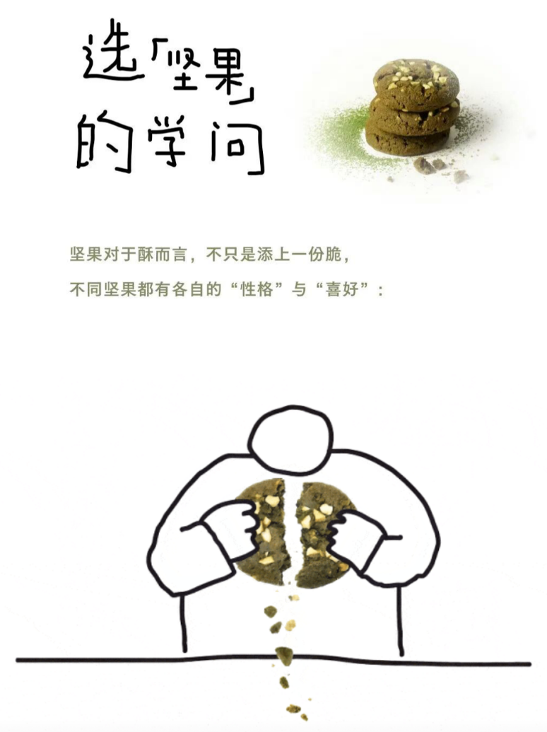 喜茶的新品“第一枚茶酥”也是酥酥的画风。随手绘制的小人,到处散落的抹茶。