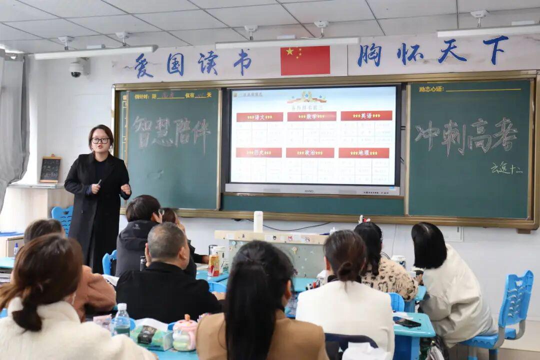 集中会议后,家长们移步至各班教室,与班主任及科任老师进行了更具针对性的深度交流。各班班主任准备了详实的数据分析,向家长们全面汇报了本班在一诊考试中的整体表现,不仅表彰了成绩优异和进步显著的同学,更精准剖析了班级当前存在的共性问题,如基础知识盲点、审题答题习惯、时间管理能力及应考心态等,并针对这些问题,阐述了下一阶段的班级管理策略与复习安排,包括强化限时训练、持续开展个性化辅导、加强心理疏导与励志教育等具体措施,展现了学校精细化管理、科学备考的坚定决心。